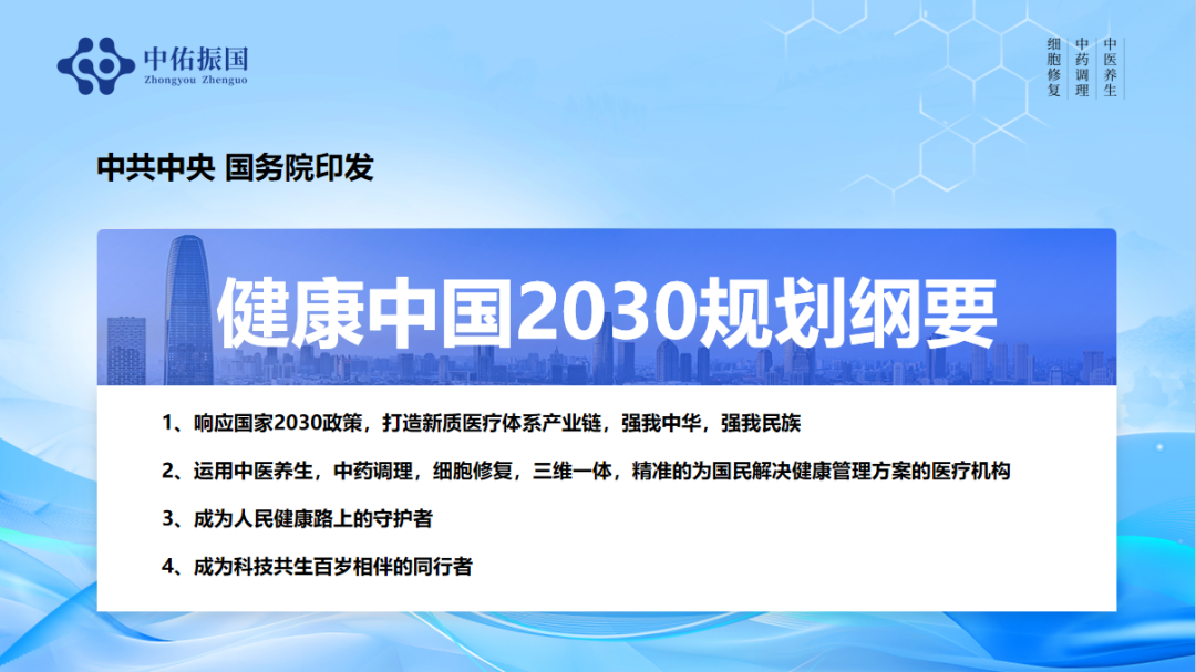 中佑振国集团围绕国务院颁发的“健康中国2030规划纲要”及党的二十届四中全会“十五五规划”搭建“双核心”战略:生物科研核心与中医药医疗核心。