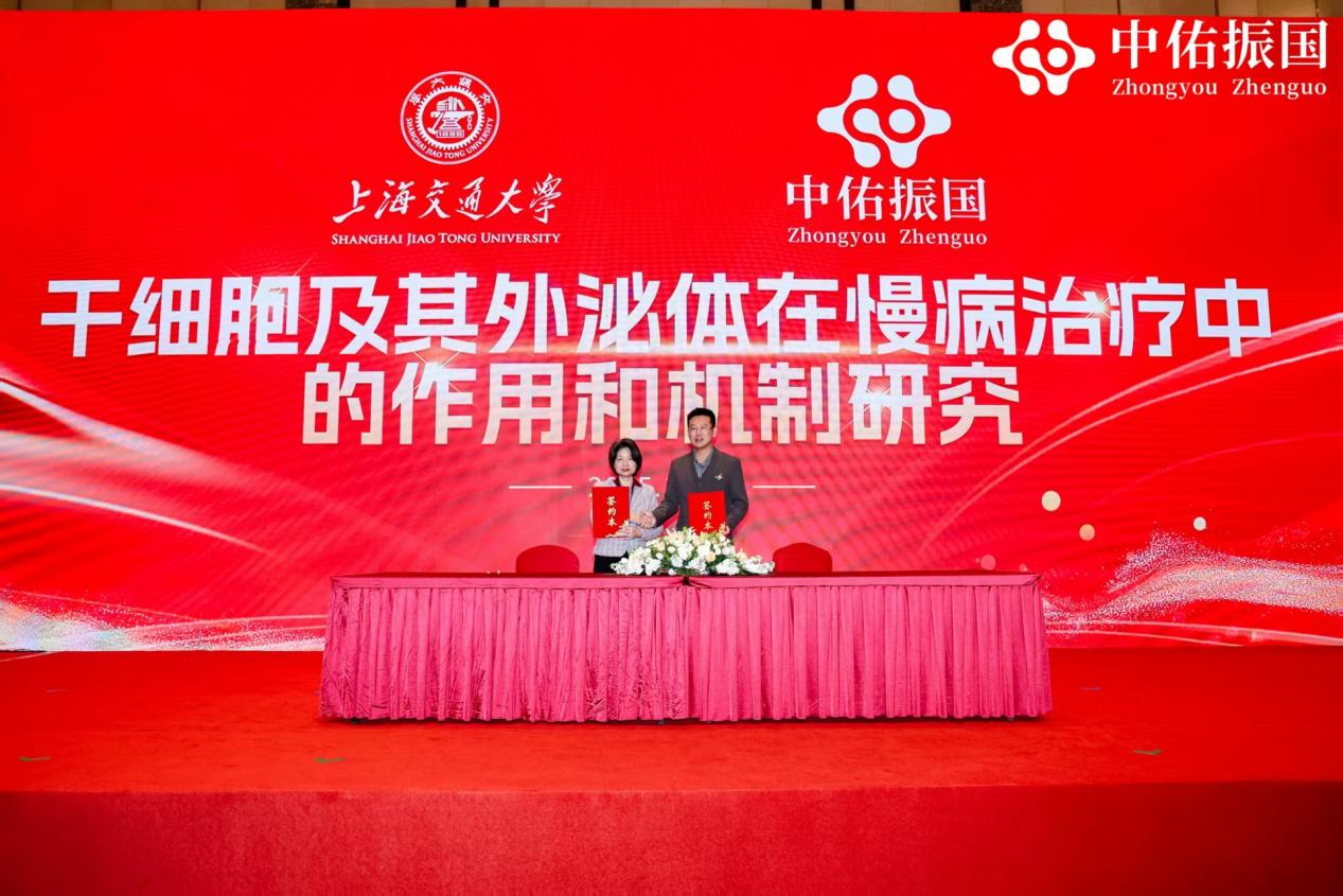 本次会议亮点纷呈,诞生多项重要合作成果:其一,中佑振国集团与上海交通大学干细胞研究中心正式达成合作,双方将联合开展细胞药物研发;其二,在全场嘉宾见证下,徐辉明博士与中佑振国总裁郑环宇完成签约,为后续深化中医药与前沿生物科技的融合应用筑牢合作根基。