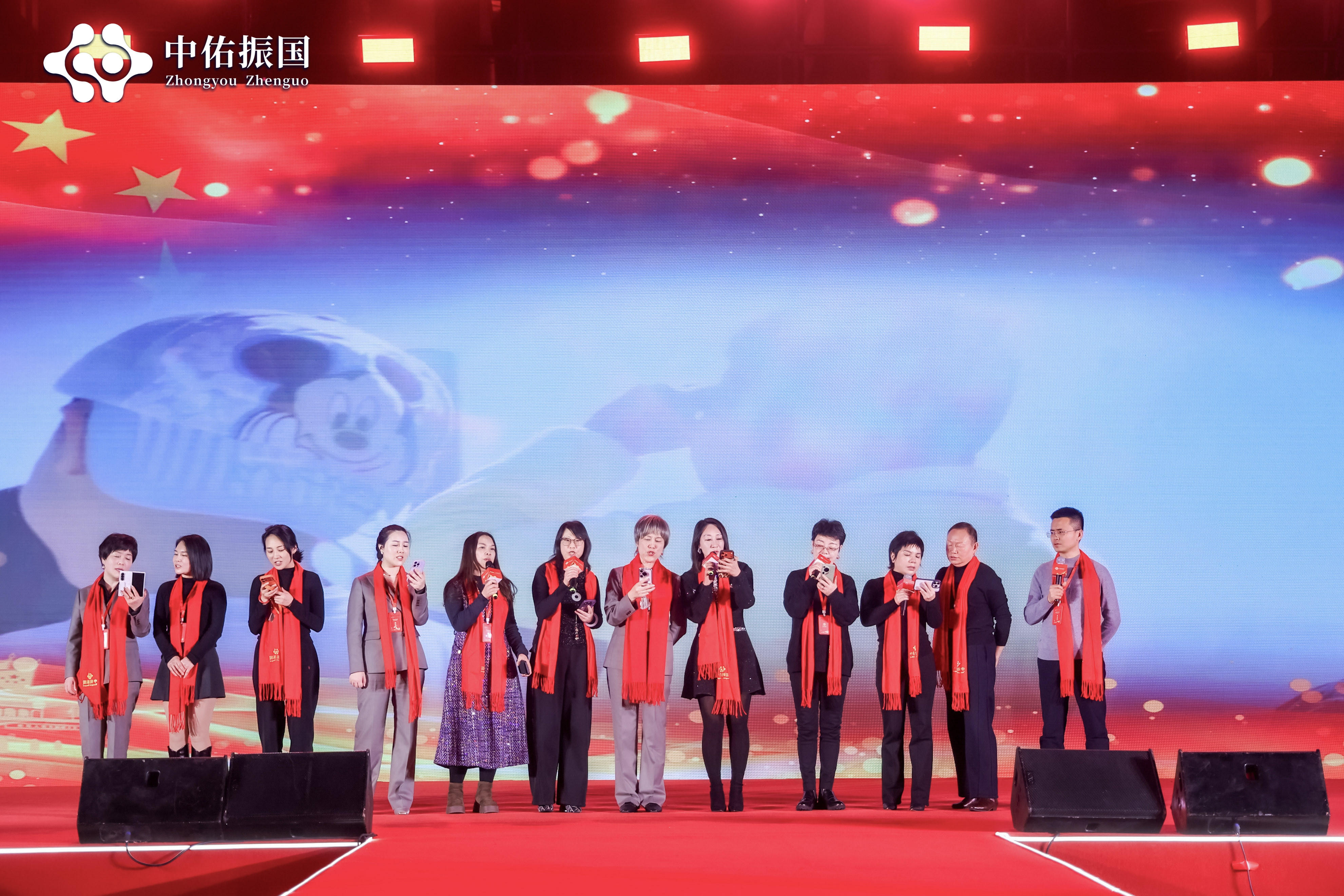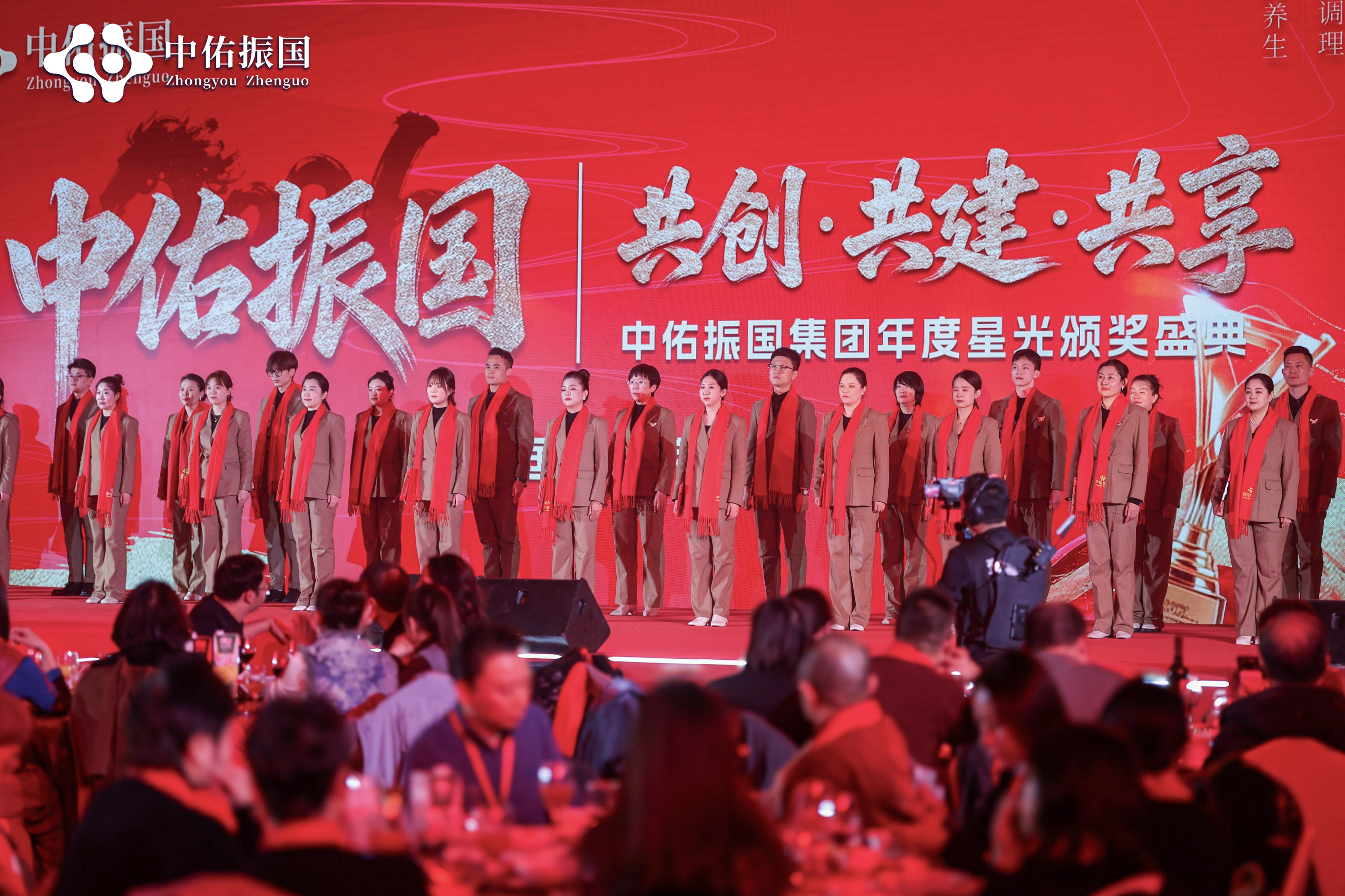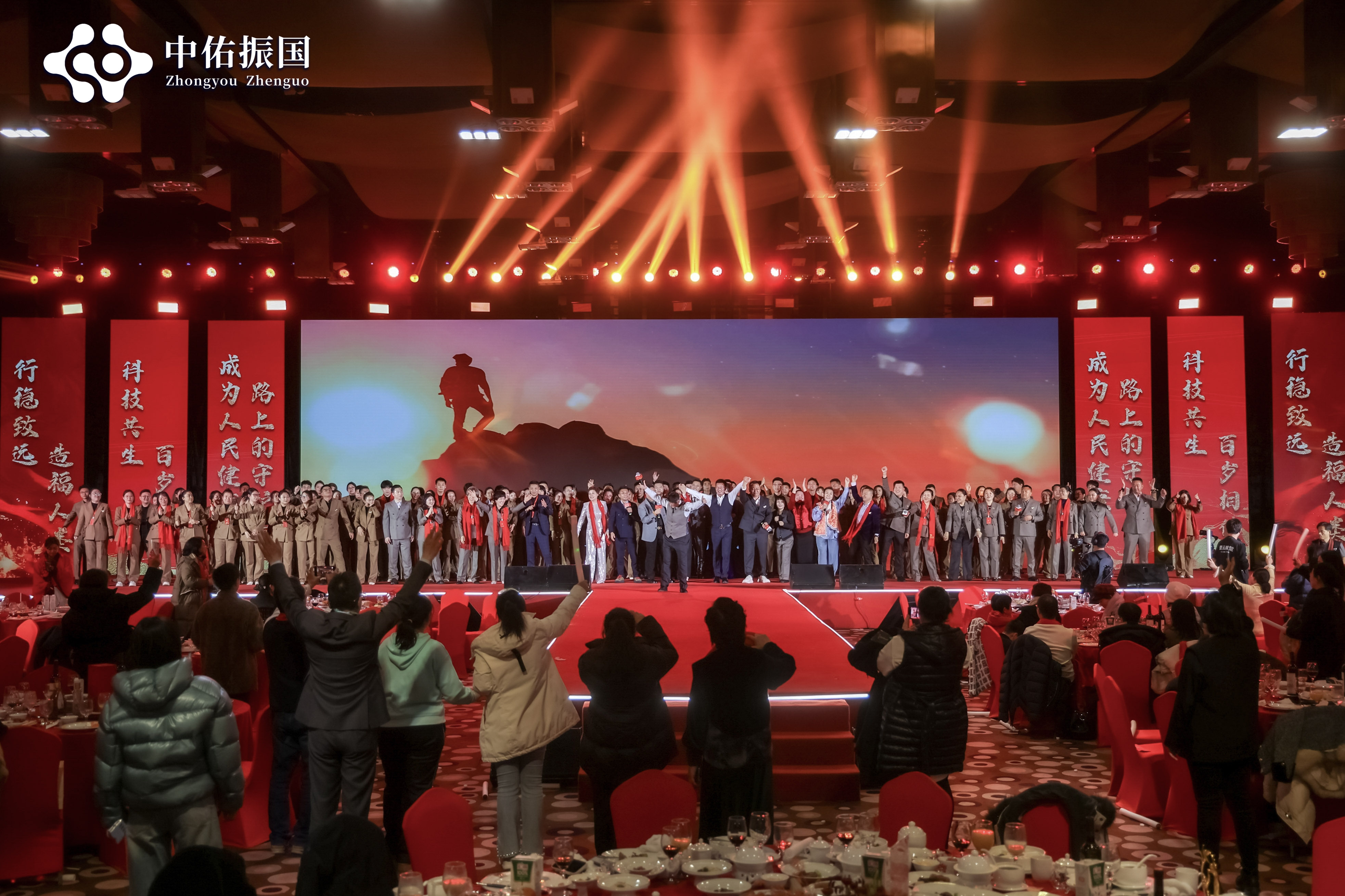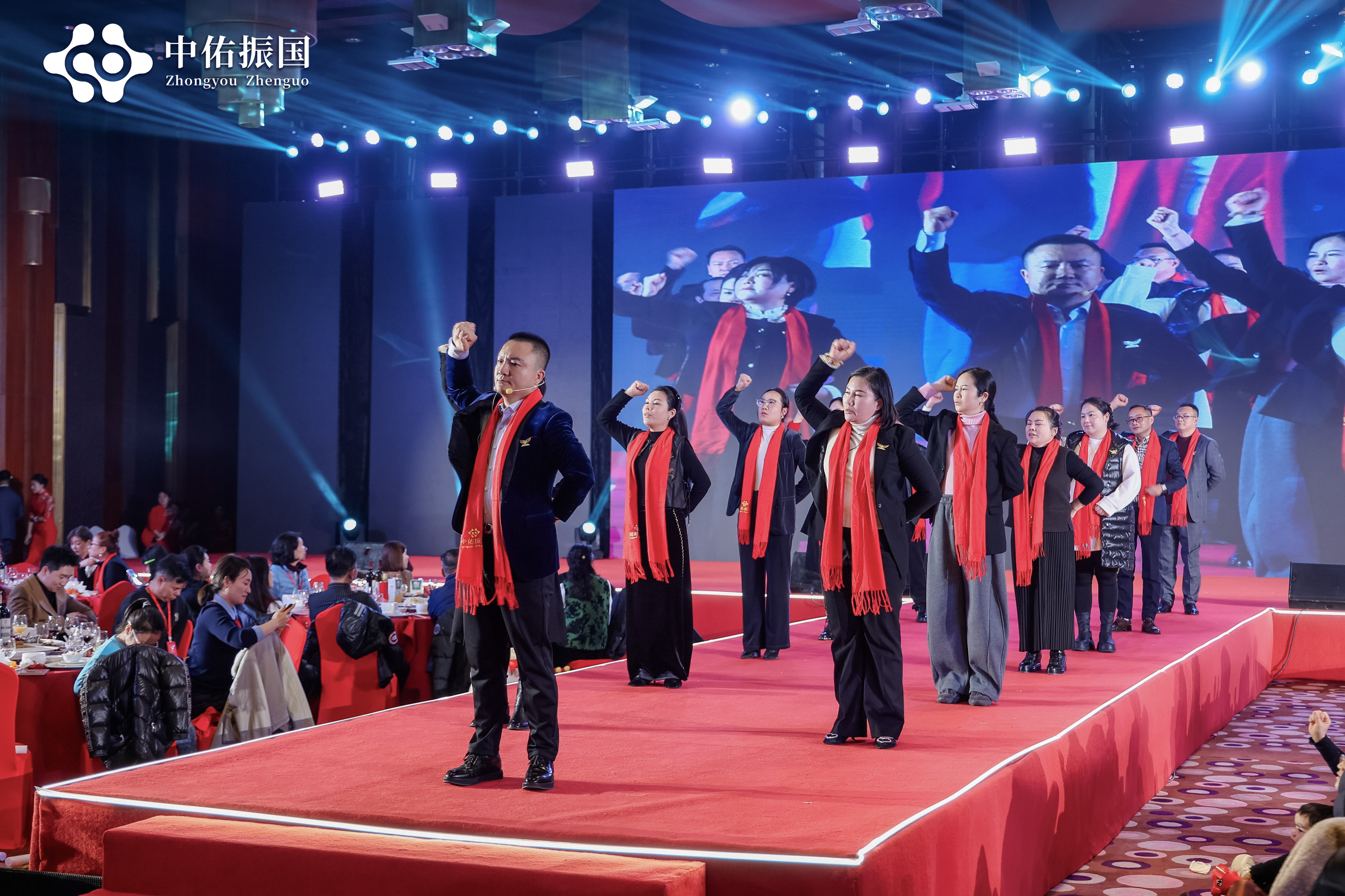 晚宴启幕环节,全场嘉宾肃立,伴随着激昂的旋律齐声高唱国歌,以最崇高的敬意拉开了团队展示的序幕。紧接着,中佑振国五十人方阵以排山倒海之势,齐声诵响 “企业之歌”,整齐划一的节奏与嘹亮的声音瞬间点燃全场,展现出势不可挡的团队力量。随后,方阵无缝衔接,深情演绎舞蹈《听我说谢谢你》,将激昂的豪情化作细腻的感恩,用灵动的舞步与统一的姿态传递出温暖与协作的力量,完美诠释了中佑振国 “刚柔并济” 的企业形象。