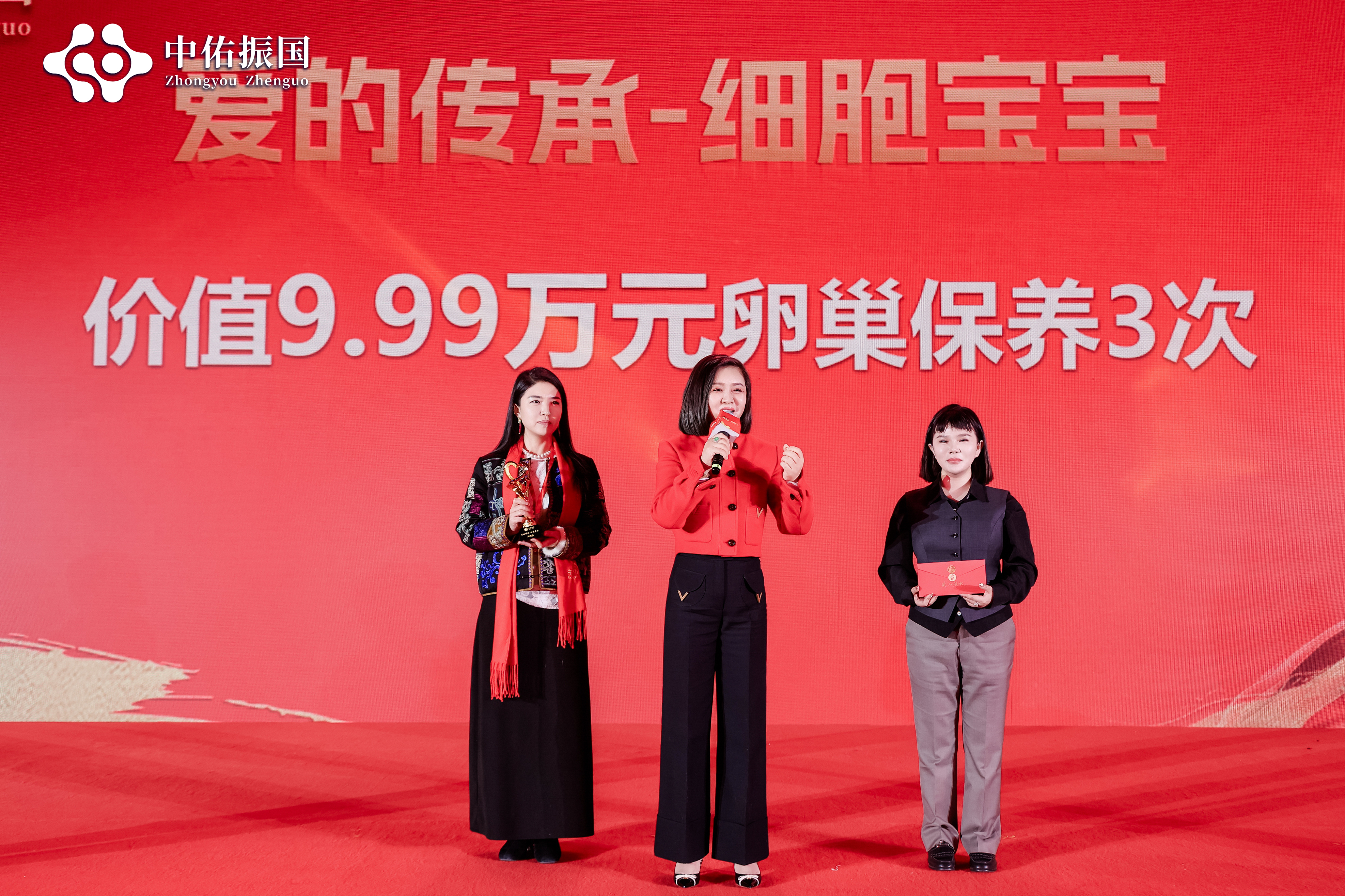 “细胞宝宝・爱的传承” 专项奖励环节温情呈现,表彰了两位通过集团 “吉祥三宝” 体系成功圆梦的母亲——高艳飞和刘大囍。在董事长刘力嘉女士的深情见证下,这份殊荣不仅是对新生命降临的美好祝福,更生动诠释了中佑振国用专业守护家庭幸福、传递大爱的品牌初心。